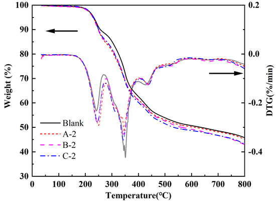In order to better study the effect of GO on intumescent coatings at extremely low dosages, A-2, B-2, C-2, and blank groups with the most significant differences in fire-resistance performance were selected for subsequent research. We conducted TG of the GO flake-containing coatings to determine their thermal stability, and the TG curves are presented in