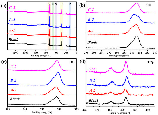 Table 2. The carbon (C) contents of the blank and the A-2, B-2, and C-2 coatings were approximately 48.65%, 46.83%, 43.16%, and 44.46%, respectively. The blank had the highest C content and the lowest oxygen (O) content, which is attributable to its having a lower total content of O, N, P, and Ti than the other coatings, due to their forming less TiP