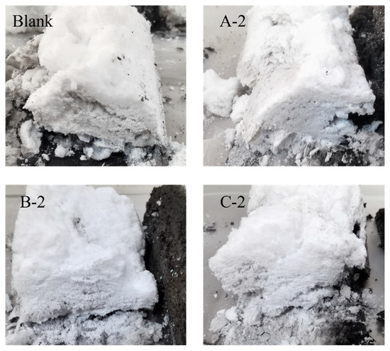Figure 8, the cross-section of the char layer of three GO fireproof coatings shows that there is a large hollowing structure in the char layer of the blank group, which seriously affects the fire-resistance performance of the fireproof coating. However, the addition of GO to the group has significantly improved the situation. Nevertheless, the fireproof coating in group A-2 still exhibits significant hollowing, while group C-2 shows almost no observable hollowing. The char-layer section of group B-2 is essentially free of hollowing, exhibiting a dense structure that effectively blocks heat transfer. By adding GO to the fireproof coating, we can effectively reduce the presence of macroscopic hollowing, lower the thermal insulation coefficient, and enhance the fire-resistance performance of the coating.