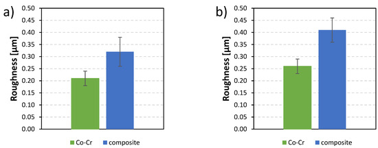 The roughness of two dental material surfaces, Co-Cr alloy and composite: (a) arithmetic average roughness (Ra) and (b) root mean square roughness (Rq).