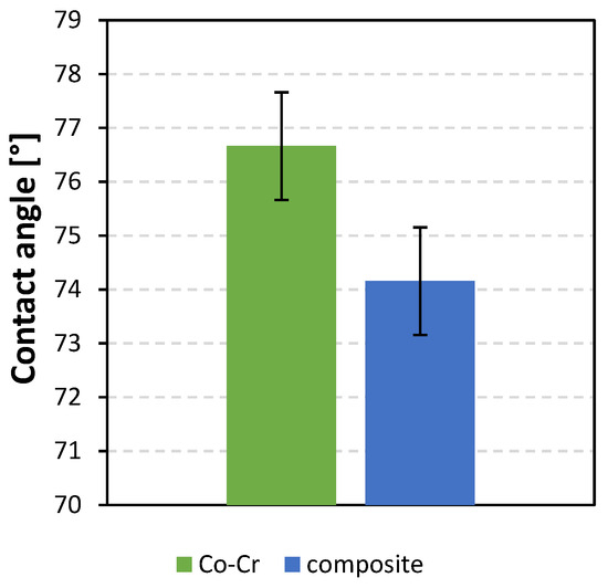 The contact angles of a water droplet on both dental material surfaces were measured with an optical tensiometer. For both surfaces, several measurements were performed, and the average contact angles with their standard deviation were calculated. Figure 2 shows the contact angles of the Co-Cr alloy (76.63° ± 0.5°) and the composite (74.10° ± 0.5°). Both surfaces were hydrophilic.