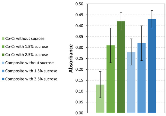 Figure 5 shows the absorbance of crystal violet extracted from bacterial cells adhered to the Co-Cr and composite surfaces. The highest absorbance was measured for the bacteria adhered to the composite surfaces with 2.5% sucrose (0.43 ± 0.04), and the lowest, for Co-Cr surfaces without sucrose (0.13 ± 0.06). Lower absorbance was measured on surfaces immersed in a solution without sucrose than on those in solutions with added sucrose. Before the addition of sucrose, the lowest bacterial adhesion extent was measured on Co-Cr surfaces, and the largest, on composite surfaces. However, bacterial adhesion was similar for both surfaces after sucrose addition.