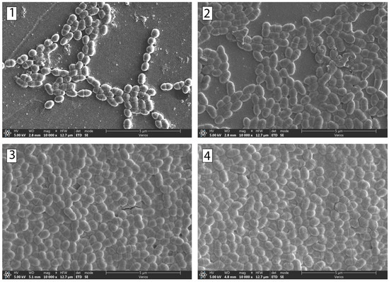 SEM micrographs of the bacteria S. mutans after 14 h of incubation time. The micrographs are of Co-Cr surfaces with the following sucrose concentrations: (1) 0%, (2) 1.5%, (3) 2.5%, and (4) 5%.