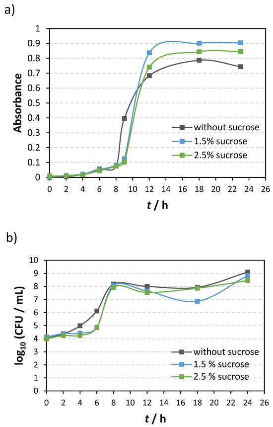 Even though the adhesion of bacteria to the surfaces increased with the increase in concentration (Figure 4, Figure 5, Figure 6 and Figure 7), a different effect was observed in planktonic cells (Figure 8). After prolonged incubation times (12 h and more), the number of dead and alive bacterial cells measured by absorbance was higher at 1.5% of sucrose than at 2.5%. Previous research also showed a decrease in the number of planktonic cells of S. mutans [41] and Gram-positive bacteria Listeria monocytogenes [42] with an increase in sucrose concentration. The observed decrease in the number of planktonic cells was attributed to an increase in osmotic pressure caused by higher sucrose concentration [41], but the exact mechanism of inhibition was not defined.