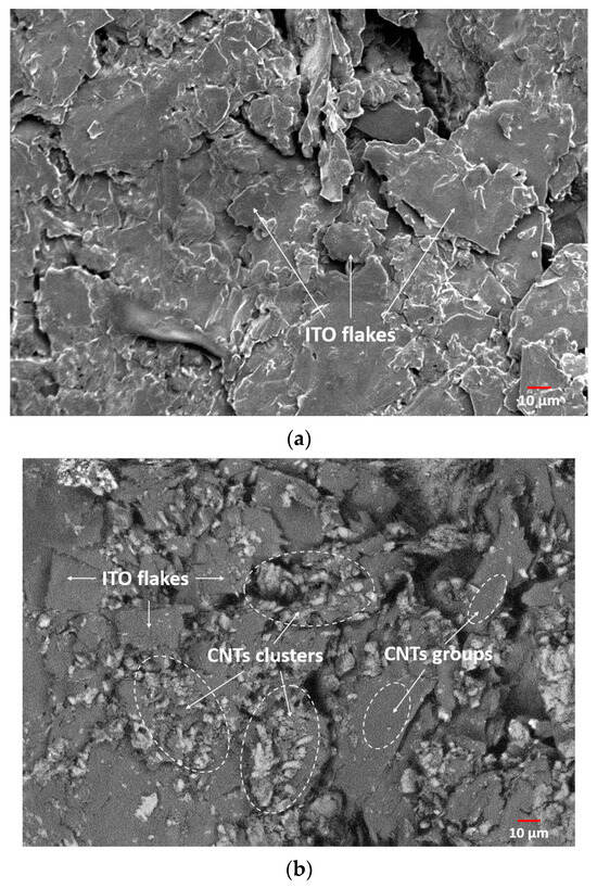 Indium-tin oxide thin films, prepared using the laser-oriented deposition method, have a flake-shaped structure (Figure 1a). In cases with the LOD of the single-wall carbon nanotubes on the surface of pure ITO, the morphology of the composite coatings contains areas with various densities of the deposited nanoparticles: clusters and groups of CNTs, respectively (Figure 1b). For a quantitative comparison of the roughness of the ITO-based coatings, the AFM data should be considered.
