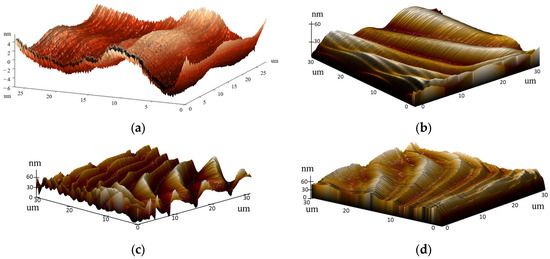 Atomic force profile of the ITO modifications: (a) pure ITO; (b) ITO with CNTs (E = 100 V/cm); (c) ITO with CNTs (E = 200 V/cm); (d) ITO with CNTs (E = 600 V/cm).