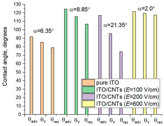In order to receive additional information about the relief of ITO modification, the dynamic wetting angle of the system “5CB-ITO” was measured. The choice of 5CB liquid crystals is made for several reasons: it is a viscous liquid, so during the measurements of the drops in dynamic, it is possible to quantitively estimate the states (Cassie–Baxter, Wenzel or smooth); historically, ITO/CNTs structures were developed for liquid crystal orientation, and these interfaces have practical applications in electro-optics [53,54].
