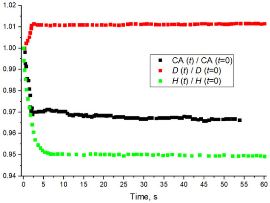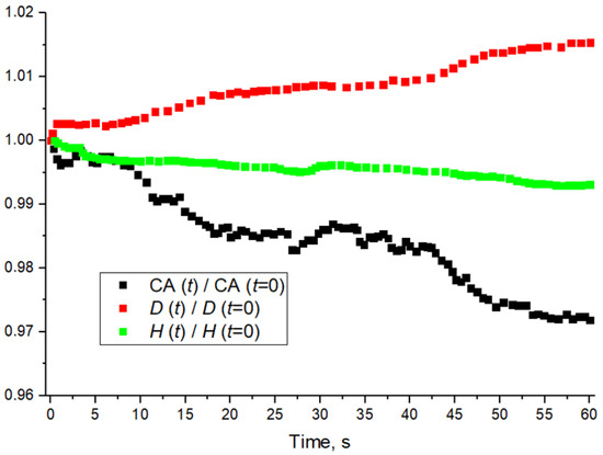 These mechanisms can be qualitatively explained by measuring the diameter, height, and wetting angle of a drop over time. The time interval of the measurements is 60 s, where the moment of applying the drop to the substrate when the syringe is disconnected is taken as the starting point. Then, within a few seconds, the drop spreads to an equilibrium state. This gap is characterized by a sharper change in the diameter and height of the drop, and, as a result, a change in the contact angle. Then, droplet absorption and evaporation are successively dominant mechanisms.