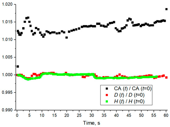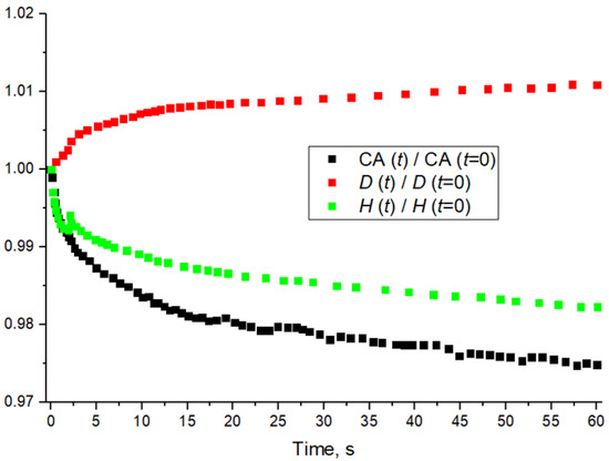 In the case of the “5CB-pure ITO”, the equilibrium state was gained after 2.9 s beyond the drop deposition. This fact was approved by the sharp rise in the drop diameter function versus time (Figure 5). Note that a drop height drop of 5% ends with saturation at 7.8 s. In the range of 2.9–7.8 s, the dominant mechanism is droplet absorption (presumably, the penetration of the LC dipoles into the gaps between ITO grains). In the range of 7.8–60.0 s, a small decrease in all characteristics is observed, which is due to the insignificant evaporation of the drop material.