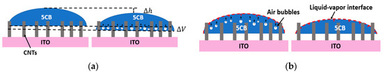 The possible mechanism of the height and volume of the 5CB drop on the ITO with the CNT surface changing: (a) the moment of the contact of the drop with the surface (left) and the absorption of the drop by the surface with the formation of air bubbles (right); (b) droplet evaporation, air–droplet interface before the air bubbles crossing (left) and after (right).
