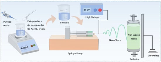 As antibacterial raw materials, silver nanopowder (particle diameter distribution between 80 and 100 nm) and silver nitrate crystal (AgNO3, white crystal, purity ≥ 99.0%) were purchased from Green Resource Co., Ltd. (Incheon, Republic of Korea) and Sigma Aldrich (St. Louis, MO, USA), respectively. Polyvinyl alcohol (PVA), as a polymer fiber carrier for antibacterial agents, was purchased from Daejung Chemicals & Metals Co., Ltd., Siheung-si, Republic of Korea. Purified water (conductivity: Max. 2.0 μs/cm; resistivity: Min. 0.5 MΩ) for dissolving PVA was purchased from Samchun Pure Chemical Co., Ltd., Pyeongtaek-si, Republic of Korea. The initial bacterial solutions used to test the antibacterial performance of the filter membranes, including Gram-negative bacterium Escherichia coli (E. coli) and Gram-positive Staphylococcus aureus (S. aureus), were purchased from Biozoa Biological Supply Co., Ltd., Seoul, Republic of Korea. All the above reagents were used as received without further purification.