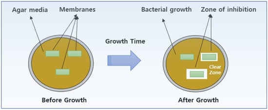 In this study, Escherichia coli (E. coli) and Staphylococcus aureus (S. aureus) were used for the antibacterial activity test. Before starting to test the antibacterial properties of the membranes, all samples were subjected to UV treatment for 2 h on a clean bench. Then, a series of samples with a size of 10 × 25 cm were cut from the prepared fiber membranes using sterile scissors. The cut samples were lightly pressed onto the surface of agar medium inoculated with bacteria to ensure close contact with the agar surface and incubated for 24 h at 37 °C in a constant-temperature incubator. According to the disk diffusion test method, the analysis of antibacterial ability is achieved by measuring the zone of inhibition (clear zone) as shown in Figure 2. An evaluation of antibacterial ability is then made using the following equation: