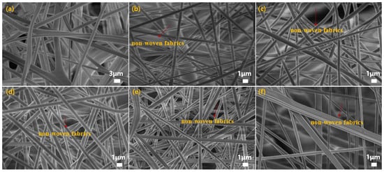 SEM images of the composite fibers: (a) M1, (b) M2, (c) M3, (d) M4, (e) M5, (f) M6. M1: raw non-woven fabric; M2: coating with pure PVA fibers; M3: coating with pure 1 wt% Ag nanopowder; M4: coating with pure 2 wt% Ag nanopowder; M5: coating with pure 1 wt% AgNO3; M6: coating with pure 2 wt% AgNO3.