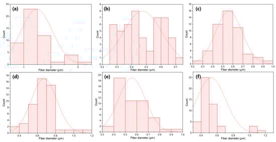 Fiber diameter distribution of (a) M1, (b) M2, (c) M3, (d) M4, (e) M5, (f) M6. M1: raw non-woven fabric; M2: coating with pure PVA fibers; M3: coating with pure 1 wt% Ag nanopowder; M4: coating with pure 2 wt% Ag nanopowder; M5: coating with pure 1 wt% AgNO3; M6: coating with pure 2 wt% AgNO3.
