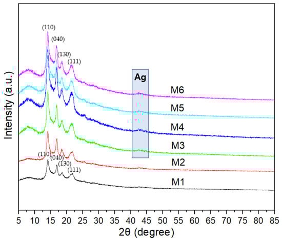 XRD spectra of M1, M2, M3, M4, M5, and M6. M1: raw non-woven fabric; M2: coating with pure PVA fibers; M3: coating with pure 1 wt% Ag nanopowder; M4: coating with pure 2 wt% Ag nanopowder; M5: coating with pure 1 wt% AgNO3; M6: coating with pure 2 wt% AgNO3.