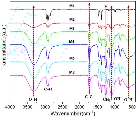 FTIR spectra of M1, M2, M3, M4, M5, and M6. M1: raw non-woven fabric; M2: coating with pure PVA fibers; M3: coating with pure 1 wt% Ag nanopowder; M4: coating with pure 2 wt% Ag nanopowder; M5: coating with pure 1 wt% AgNO3; M6: coating with pure 2 wt% AgNO3.