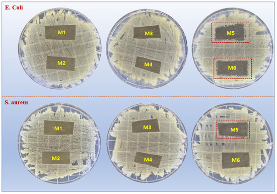 Comparison of antibacterial ability of all membranes against Escherichia coli and Staphylococcus aureus. M1: raw non-woven fabric; M2: coating with pure PVA fibers; M3: coating with pure 1 wt% Ag nanopowder; M4: coating with pure 2 wt% Ag nanopowder; M5: coating with pure 1 wt% AgNO3; M6: coating with pure 2 wt% AgNO3.