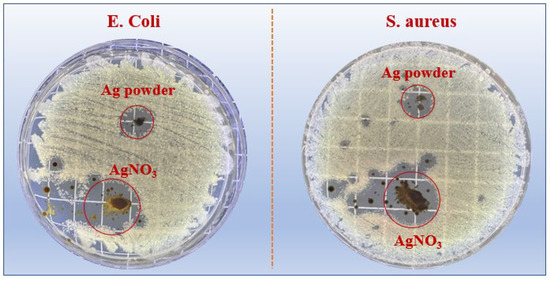 To further investigate the antibacterial mechanisms of silver powder (AgNP) and silver nitrate (AgNO3) against E. coli and S. aureus, 0.002 g samples of AgNP and AgNO3 were placed on the culture media of E. coli and S. aureus. Their antibacterial activity is shown in Figure 10. As shown in the figure, the clearance zone of inhibition of AgNO3 was slightly larger than that of AgNP. After calculation, the clearance zones of inhibition of AgNP and AgNO3 on E. coli were approximately 11.41 mm and 19.39 mm, respectively, and those on S. aureus were 11.15 mm and 18.88 mm, respectively. The antibacterial ability of the same antibacterial agent against E. coli and S. aureus is almost the same, indicating that both AgNP and AgNO3 have high antibacterial activity and do not exhibit different antibacterial activities due to differences in bacterial cell wall thickness. The higher antibacterial activity exhibited by AgNO3 than by AgNP can be attributed to the presence of Ag ions in AgNO3. Interaction with Ag ions can directly destroy the bacterial cell wall and cause bacterial inactivation, while AgNP undergoes oxidation before interacting with the cell wall, which may lead to the disappearance of some antibacterial activity during the oxidation process. This is consistent with the report in [33].