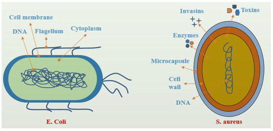 Figure 11 shows the cellular structure of E. coli and S. aureus. E. coli and S. aureus both belong to the prokaryotes, both containing cellular structures, and their cells do not have formed nuclei. They both contain two types of nucleic acids, DNA and RNA, and only have ribosomes as organelles. Therefore, their ecological commonalities include their cell structure, cell shell (peptidoglycan), nucleoid composed of DNA and proteins, ribosomes, and cell fluid. According to statistics, E. coli bacterial cells are typically approximately 2.0 μm long and rod-shaped with a diameter of 0.25–1.0 μm [34]. Cells also display many pili or fimbria, usually extending to the glass surface, but in some cases, they can also be seen on the cell surface. S. aureus typically has a nearly spherical structure, approximately 0.5–1.5 µm in diameter, and most cells exist in clusters, with few isolated cells; the texture on the cell surface is very rough [35]. In addition, E. coli is a Gram-negative bacterium with a relatively thin peptidoglycan layer of 7–8 nm, compared to that of Gram-positive S. aureus (20–80 nm). The function of peptidoglycan is to endow the cell wall with shape and strength. The thickness of the peptidoglycan layer plays an important role in providing a rigid structure that serves as a barrier for chitosan interactions [34,35].