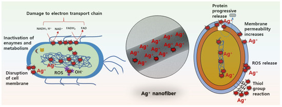 - Yang, Y.; Zhang, Z.; Wan, M.; Wang, Z.; Zou, X.; Zhao, Y.; Sun, L. A facile method for the fabrication of silver nanoparticles surface decorated polyvinyl alcohol electrospun nanofibers and controllable antibacterial activities. Polymers 2020, 12, 2486. [Google Scholar] [CrossRef] [PubMed]