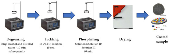 The solutions used contained the following accelerators and inhibitors: HNO3, NaOH, NaNO2, and Na5P3O10, in different amounts [14]. The phosphating stage lasted 60 min at a temperature of 90 °C. In these solutions, MgCO3, Zn chips, Ni powder, Fe, Mn, and H3PO4 were added to obtain the metallic compounds that would lead to the formation of the phosphate layer [31]. Afterwards, the samples were rinsed with water and dried at room temperature [32]. The scheme of the phosphating process is shown in Figure 1.