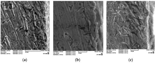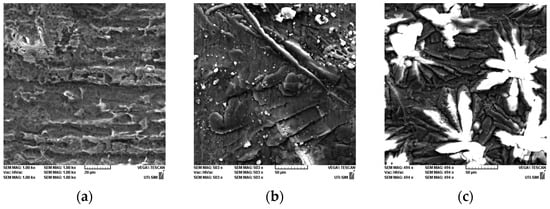 The structural analysis of the realized surfaces, Figure 2a–c, for all applied phosphating cases shows a surface that is generally covered with partial deposits of compounds from the electrolyte solutions used during the phosphating process; see Table 2.