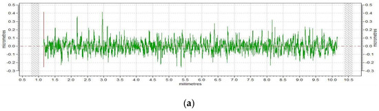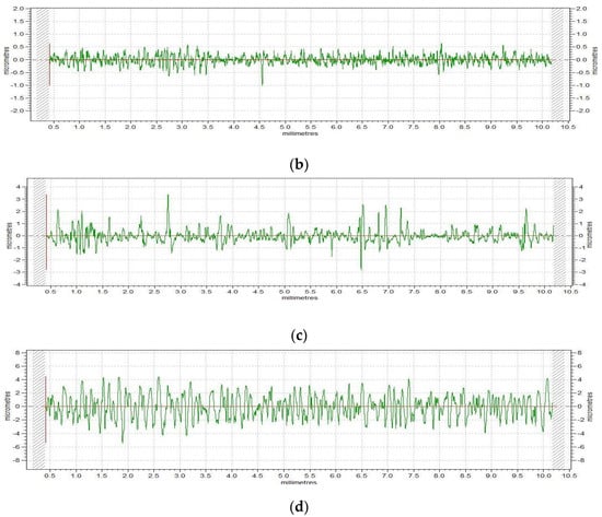The profiles of the surfaces of the phosphated samples confirm the inhomogeneities of the deposits that are characteristic of this process, but they show a generally homogeneous coverage on the entire surface, Figure 4b–d. One of the parameters most used to characterize the profile of a surface is Ra, a dimensional unit usually given in mm or μm.