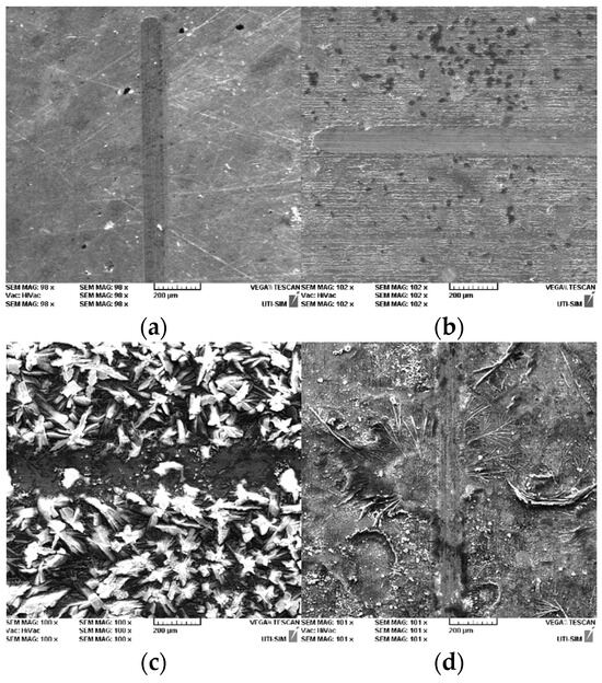 Apart from the precipitates formed on the surface, one can also see crystals in various forms, Figure 2a–c, which mainly vary depending on the solution used for phosphating. The dimensions of the crystallites, some cylindrical and others acicular, are approximately 5–50 μm.