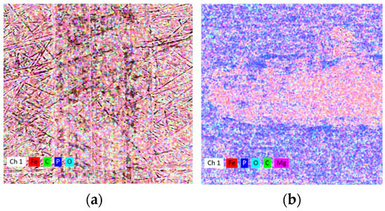 According to some previous studies [35], one of the compounds that forms on the surface is also phosphophyllite; for the second solution, the presence of the Zn2Fe(PO4)24H2O phase was confirmed [15,36]. Also, for the sample phosphated with Zn, solution II, the presence of zinc phosphate tetrahydrate, hopeite, was also observed.