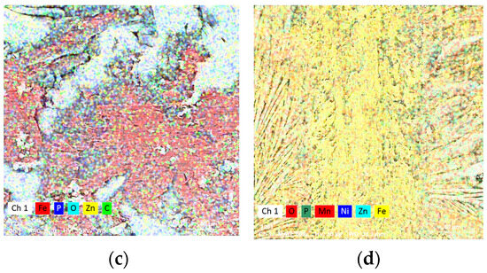 Due to the introduction of Mn into the phosphate solution, solution III, another phase that was formed was Mn2.5(HPO4)(PO4)(H2O)2 [37]. In the case of phosphating with manganese, another element that was added was nickel in the phosphating process. Its role is as a catalyst and for accelerating the formation of manganese phosphate crystals. The use of Ni in the phosphating solution helps to obtain a sealed layer consisting of regular rhombic crystals, Figure 2c. The most common type of Ni compound formed was nickel (II) phosphate.