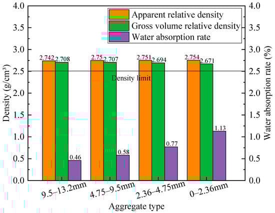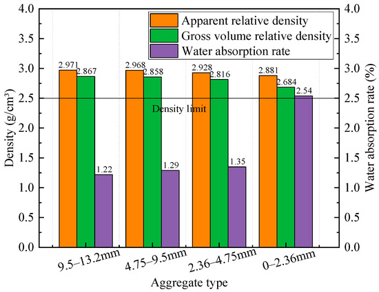 The density tests were conducted on the aggregates, which include testing the apparent relative density, the gross volume relative density, and the water absorption rate. The apparent relative density and gross volume relative density of the coarse aggregate were determined using the basket method. Due to the smaller particle size of the fine aggregate, the basket method was not applicable, so the slump cone method was employed to determine the apparent relative density and gross volume relative density of the fine aggregate; at the same time, the water absorption rate was also tested. The test results are presented in Figure 1. Due to the importance of the apparent relative density in the mix design and the regulations regarding the related engineering design requirements, the minimum limit value of the apparent relative density is marked in the figure.