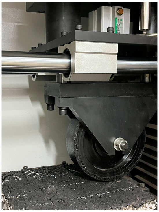 By adjusting the loading device, the contact pressure of the rubber tire on the specimen is set to 0.7 ± 0.05 MPa, and the applied total load is approximately 780 N. Additionally, the rutting test machine is equipped with a displacement sensor and a constant temperature chamber. Before starting the test, the specimen should be preheated in a constant temperature chamber at 60 °C for 5 to 12 h and maintained at 60 °C until the end of the test. Figure 4 shows the process of rutting test.