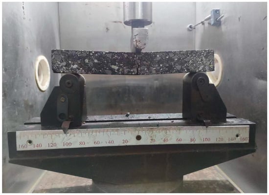 This test is conducted at a test temperature of −10 ± 0.5 °C, using a universal material testing machine with a loading rate of 50 mm/min. It is employed to evaluate the low-temperature tensile performance of asphalt mixtures, which follows the Standard Test Methods of Bitumen and Bituminous Mixtures for Highway Engineering (JTG E20-2011). The specimens are obtained by cutting them from the material compacted by a rolling compactor. The specified specimen dimensions are a prism-shaped beam with a length of 250 ± 2.0 mm, a width of 30 ± 2.0 mm, and a height of 35 ± 2.0 mm, with a span of 200 ± 0.5 mm.