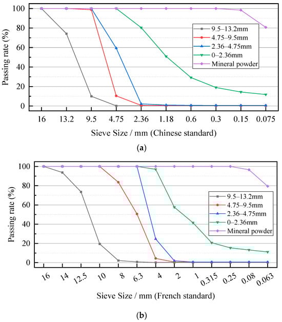 The screening results of mineral aggregate for the indoor mix design. (a) The screening results using the Chinese standard. (b) The screening results using the French standard.