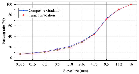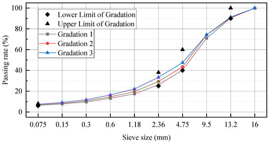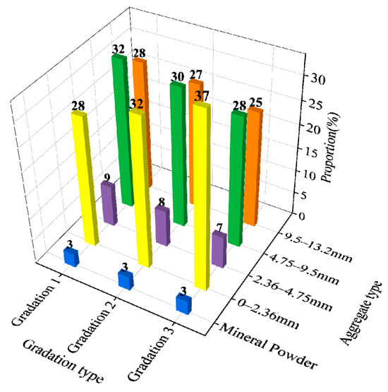 Using the reference limits of gradation control points for high-modulus asphalt mixture design, we have preliminarily selected coarse, intermediate, and fine gradations. Based on past engineering experience, we chose an asphalt-to-aggregate ratio of 4.2% (comprehensive asphalt-to-aggregate ratio of 5.2%, percentage of the sum of asphalt and high-modulus agent mass to aggregate mass) to prepare gyratory compacted specimens and to determine the volumetric properties of the mixture. Figure 8 provides a detailed table of the proportions of various specifications of aggregates in the preliminary gradation.