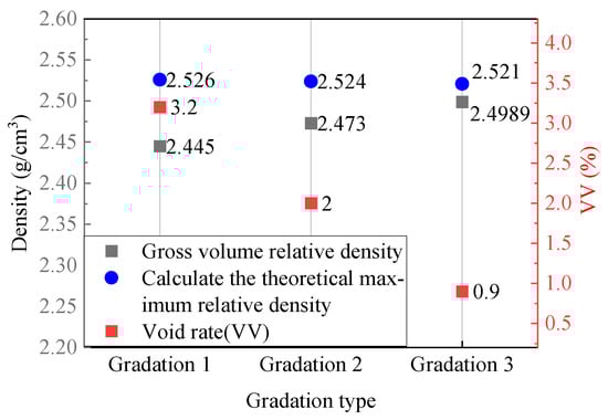 The synthetic gradation of the three selected gradations passing through the square sieve (mm) is shown in Figure 9. It can be seen that the synthetic passing rates of the three preliminary gradations all meet the control point limits for high-modulus asphalt mixture design. However, Gradation 1, which has coarser aggregate particle sizes, has a design curve too close to the control point limits. Considering the potential errors in indoor experiments, along with the construction processes, it is likely to result in the volume indicators of the rotating compacted specimens and the void ratio of the high-modulus asphalt concrete surface layer not meeting the requirements. Therefore, Gradation 1 is not considered. However, the final gradation selection also needs to consider the volume indicators of the rotating compacted specimens, as shown in Figure 10.