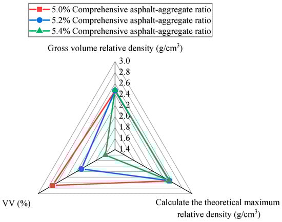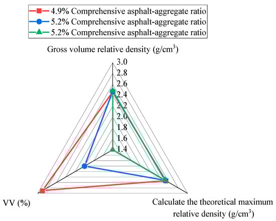Based on the on-site mix design results, rotational compaction tests were conducted using asphalt content ratios of 4.0%, 4.2%, and 4.4% (equivalent to overall asphalt contents of 5.0%, 5.2%, and 5.4%). The compaction cycle was set at 80 times, and the maximum theoretical relative density for each group was calculated. The test results are shown in Figure 19, where VV is the void rate of the specimen.