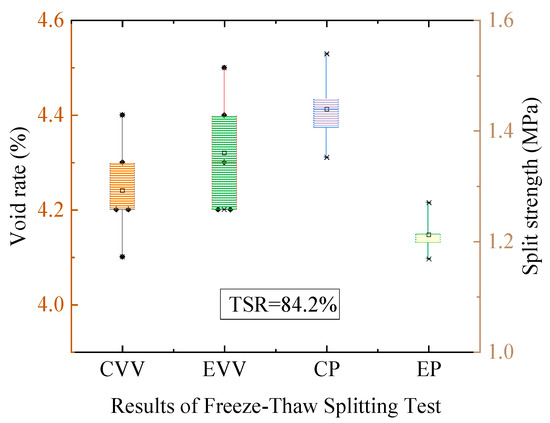 Freeze–thaw splitting tests were conducted under the optimal asphalt content ratio. Due to the effects of water in the voids of the specimen on the asphalt bonding characteristics during the freeze–thaw cycles, and considering that the splitting test evaluates the tensile stress applied to the internal bonding strength of the specimen, this test can effectively assess the water stability performance of high-modulus asphalt concrete. The test results are shown in Figure 12. CVV represents the void ratio of the control group (without freeze–thaw treatment), EVV represents the void ratio of the test group (after freeze–thaw treatment), CP represents the splitting strength of the control group, and EP represents the splitting strength of the test group.