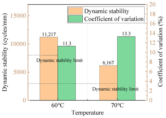 The lower coefficient of variation indicates that there is a small degree of variation among different rutting test data, and the data have high reliability. From the test results, it can be observed that as the temperature increases by 10 °C, the dynamic stability of the high-modulus asphalt mixture decreases by approximately 45%. This result is closely related to the temperature sensitivity of the asphalt materials. However, the dynamic stability test results at both temperatures are significantly higher than the technical construction requirements, demonstrating the effectiveness of the high-modulus modifier.