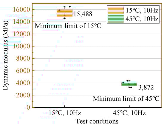 Dynamic modulus specimens can reflect the dynamic response characteristics of asphalt mixtures under traffic loads. Due to the hysteresis of the strain response during load application, it is necessary to conduct dynamic modulus tests to verify the viscoelastic properties of high-modulus asphalt mixtures. The test results are shown in Figure 14. The results indicate that the high-modulus asphalt mixture used in this study exhibits good axial mechanical performance at a loading frequency of 10 Hz.