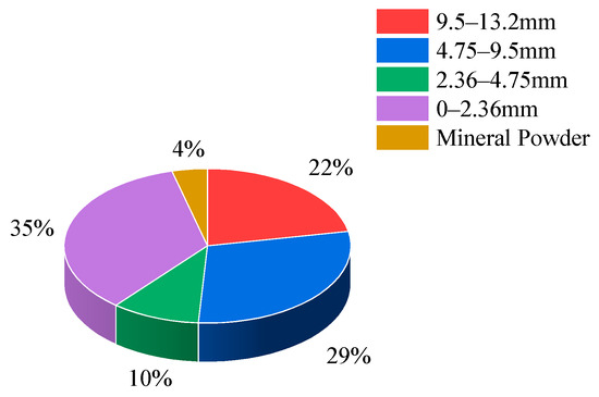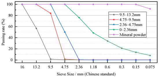 In order to ensure the effectiveness of high-modulus asphalt concrete, to explore its performance characteristics, and to provide guidance for practical engineering applications, this article initially conducted an indoor mix design. The so-called indoor mix design refers to the asphalt mixture mix proportion determined through scientific calculation and experimentation based on design requirements and construction conditions. It is the fundamental method of mixture composition design. As it is carried out in the laboratory, it is called an indoor mix design. The aggregate used for the indoor mix design was sourced from Heilongjiang Province, China. For convenience in packaging and transportation, the manufacturer defined the specifications of the aggregate based on the maximum nominal particle size when the aggregate left the factory. For the HMM-13 used in this article, coarse aggregate with particle size specifications ranging from 9.5–13.2 mm, 4.75–9.5 mm, 2.36–4.75 mm, and fine aggregate with a particle size range of 0–2.36 mm were selected.