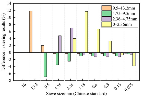 When conducting an on-site mix design, to validate the variability of incoming raw material specifications and to ensure the accuracy of the synthetic gradation in an on-site mix design, the technical service team performed a recheck of the raw material sieve analysis on materials that entered the site after the completion of the indoor mix design. Simultaneously, a comparison was made with the materials used in the indoor mix design. The sieve analysis results for the hot material bin are shown in Figure 15. The comparative results indicate that the single gradation of each raw material is not significantly different from the gradation used in the indoor mix design. The different values from the sieve analysis are shown in Figure 16, where the y-axis represents the difference between the sieving results of materials used in on-site mix design and the sieving results of materials used in indoor mix design.