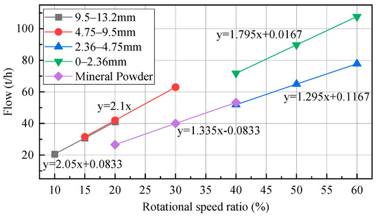 The second test utilized the Marini MAC360 mixing plant, with the cold material feed rate controlled by rotational speed. During the construction process at the site, the material proportions in each bin were ensured by setting the rotational speed for individual bins. The screen sizes of the mixing plant were 1717 mm, 1111 mm, 66 mm, and 44 mm. For this flow rate test, three trials were conducted for each material at different rotational speed ratios. Each flow rate test employed a feeding duration of 5 min. The relationship between the flow rate and the rotational speed ratio is illustrated in Figure 21.