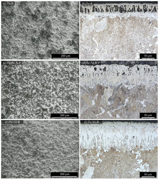 It should be noted that in the iron boride layer (the Fe-B type, Figure 1b), the needles growing into the substrate are the finest. For the mixed iron–nickel boride layer formed on previously nickel-plated steel (the Fe-Ni-B type, Figure 1f), the needles are slightly thicker, and they are thickest in a multicomponent layer on steel previously chemically nickel-plated (Ni-Fe-B-P type, Figure 1d). For all tested substrate variants, both precoated with nickel and uncoated, a bright-etching zone, most likely silicon ferrite, can be observed between boride needles and substrate and under the tips of the needles. The darker zones in the steel substrate are composed of a pearlitic and pearlite-ferritic structure. The cause of structural changes in the substrate in the vicinity of the boride layer is most likely local increases in the concentration of silicon and carbon rejected down into the substrate by the growing boride. Such a phenomenon was observed in the borided high alloy nanobainitic steels we recently investigated [28,29]. The formation of the pearlitic zone results from the substrate’s enrichment with carbon due to pushing by the forming layer of borides, which do not dissolve carbon. Similarly, silicon, which is present in the C45 steel and does not dissolve in the layer, accumulates in the vicinity of the borides, forming silicon ferrite. The thickness of the carbon enrichment zone, although uneven, ranges between twice and four times the thickness of the boride layer. Pores are an important characteristic of the microstructure of all tested boride layer variants (Figure 1b,d,f). In addition to the relatively small oval pores located mainly near the surface, large voids are observed in the areas between the boride needles. These zones are located mainly above the transition region between the layer and the substrate. Particularly large voids between the needles, which have a significant share in the volume of the layer, occur in the Fe-B-type layer (Figure 1b).