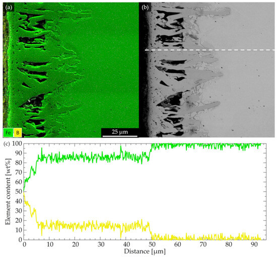 SEM image of Fe-B-type layer in SE mode combined with EDS mapping (a), the image in BSE mode with the linescan track (b), EDS microanalysis linescan (c). The colours used for the linescan graph correspond to those used on the EDS mapping: green for iron and yellow for boron.