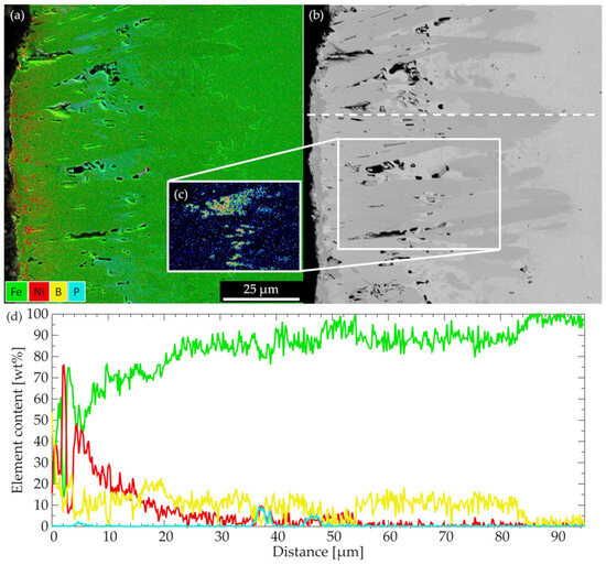 Iron–nickel boride layers are less porous and more compact in structure. However, in the Fe-Ni-B-P-type layer produced on a chemically nickel-plated substrate, the porosity of a similar nature as in the Fe-B layer is maintained, although reduced (Figure 1b,d). The least porous is the Fe-Ni-B boride layer (Figure 1e). Moreover, the zone of large voids between the needles does not occur in this layer. The details of the microstructure and chemical composition of the tested boride layers are revealed by scanning microscope SEM observations and EDS chemical composition measurements, as shown in Figure 2, Figure 3 and Figure 4.