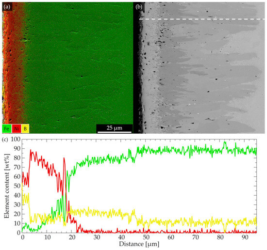 SEM image of Fe-Ni-B-type layer in SE mode combined with EDS mapping (a), the image in BSE mode with the linescan track (b), EDS microanalysis linescan (c). The colours used for the linescan graph correspond to those used on the EDS mapping: green for iron, red for nickel and yellow for boron.