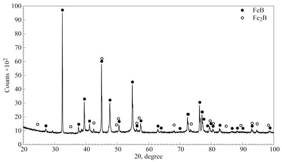 The phase composition of the boride layers was determined using X-ray diffraction (XRD). Measurements were carried out on a Rigaku SmartLab 3 kW diffractometer (Tokyo, Japan). For the apparatus, the radiation source was a Cu tube with operating parameters of U = 40 kV and I = 30 mA. The Bragg–Brentano measuring geometry was used with a measuring step of Δ2θ 0.02°.
