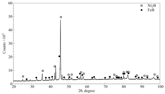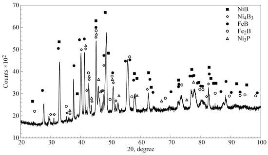 The differences in contrast visible in the BSE mode show that, in accordance with the theory, the boride layers have a zone structure. For the Fe-B-type layer, two zones can be distinguished. For the Fe-Ni-B and Fe-Ni-B-P types, there are three zones differing in contrast. The internal zones, which, unlike the relatively thin surface zone, constitute the needles, partially penetrate each other in the transition area between the zones. The chemical composition analyses of the elements’ distribution (EDS) in the layers show that in the zones occurring in the boride layers formed on previously nickel-precoated substrates (Figure 3 and Figure 4), there is a chemical gradient resulting from the diffusion of iron from the substrate to the forming layer. Consequently, some of the phases forming these zones are complex nickel–iron boride phases of the general (Fe, Ni)xBy type. The X-ray diffraction patterns of the investigated model layers are shown in Figure 5, Figure 6 and Figure 7. The combined analysis of the XRD (Figure 5, Figure 6 and Figure 7) and EDS (Figure 2, Figure 3 and Figure 4) and WDS [36,37] results of the tested model boride layers shows that hybrid processing combining boriding under glow discharge conditions at 850 °C with prior modification of the substrate by nickel coating deposition results in the formation of the phases indicated in Table 3.