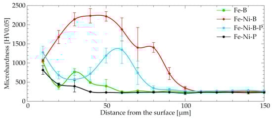 The microhardness distributions of HV0.05 in the near-surface zone of the Fe-B, Fe-Ni-B and Fe-Ni-B-P variants of borided C45 and, for comparison, the distribution for the (Fe-Ni-P) layers based on nickel–iron type (Ni, Fe)3P phosphide.